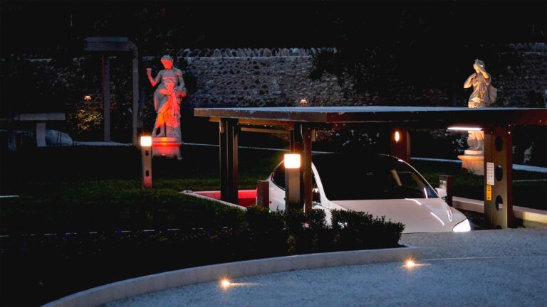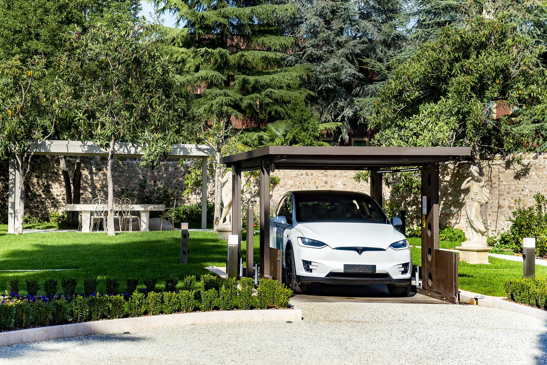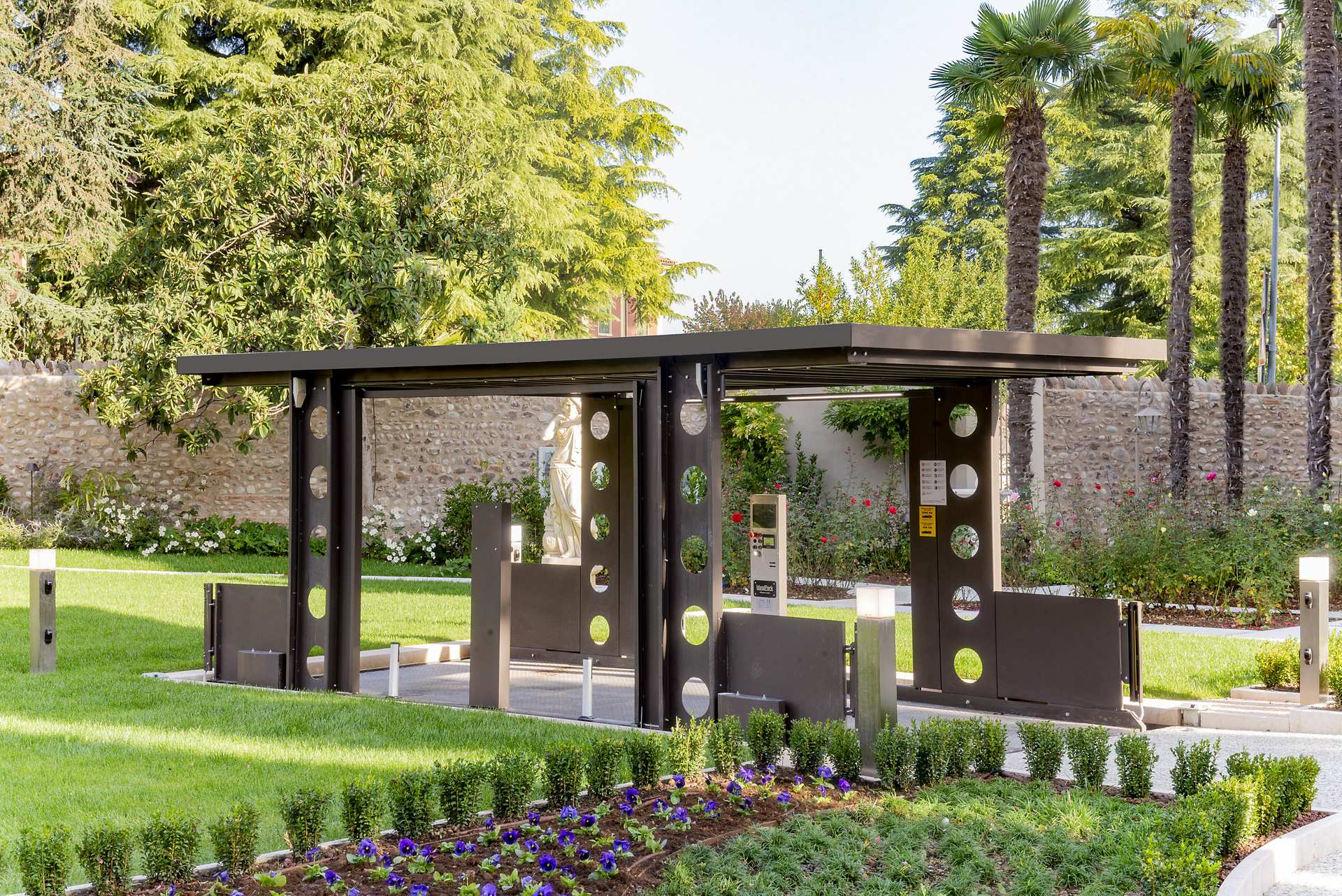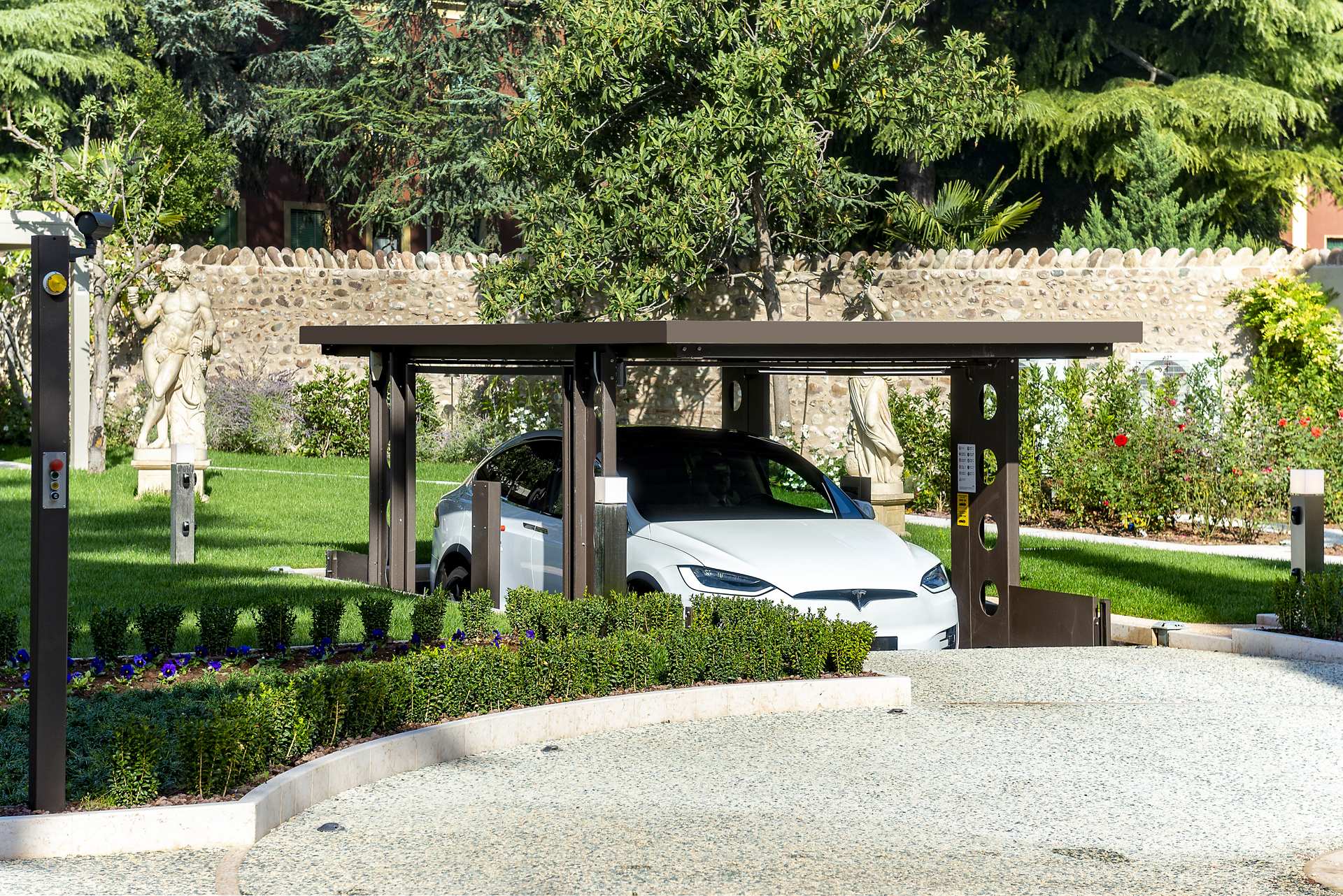 The PA4R3 roof-mounted car lift offers the convenience of having a driver on board during lifting. Featuring a 4-column structure and a pit of only 50 cm, it can bear a payload of 2700 kg or, in the XL version, up to 3500 kg. The roof deck can act as a parking surface when the system is in the rest position and can be paved for a maximum weight of 150 kg/m2, maintaining homogeneity with the rest of the yard.