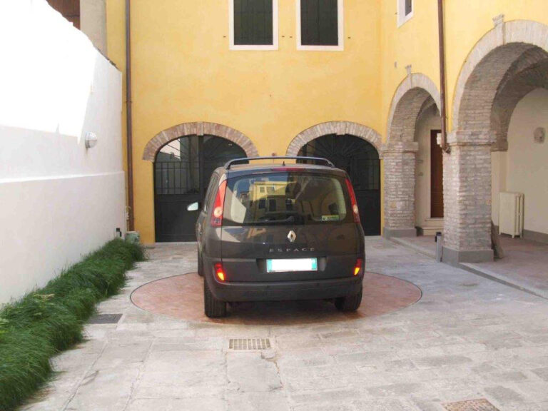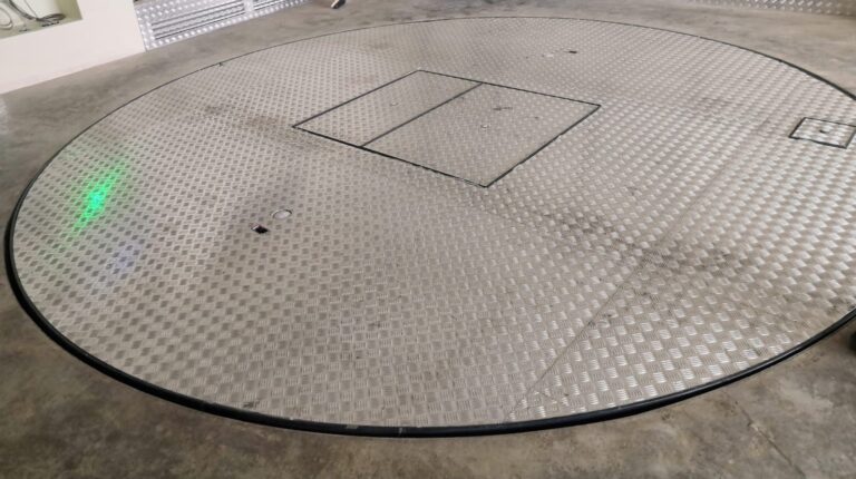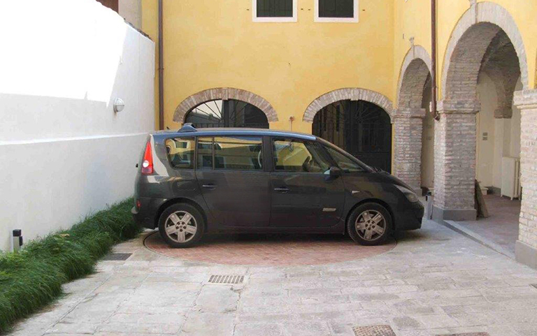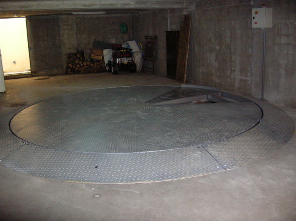 Turning platforms are systems that assist users in maneuvering in tight spaces. Mechanized parking of this type consists of a lower basement made from electro-welded steel beams, complemented by base plates and counter plates for fixing and leveling in the floor.