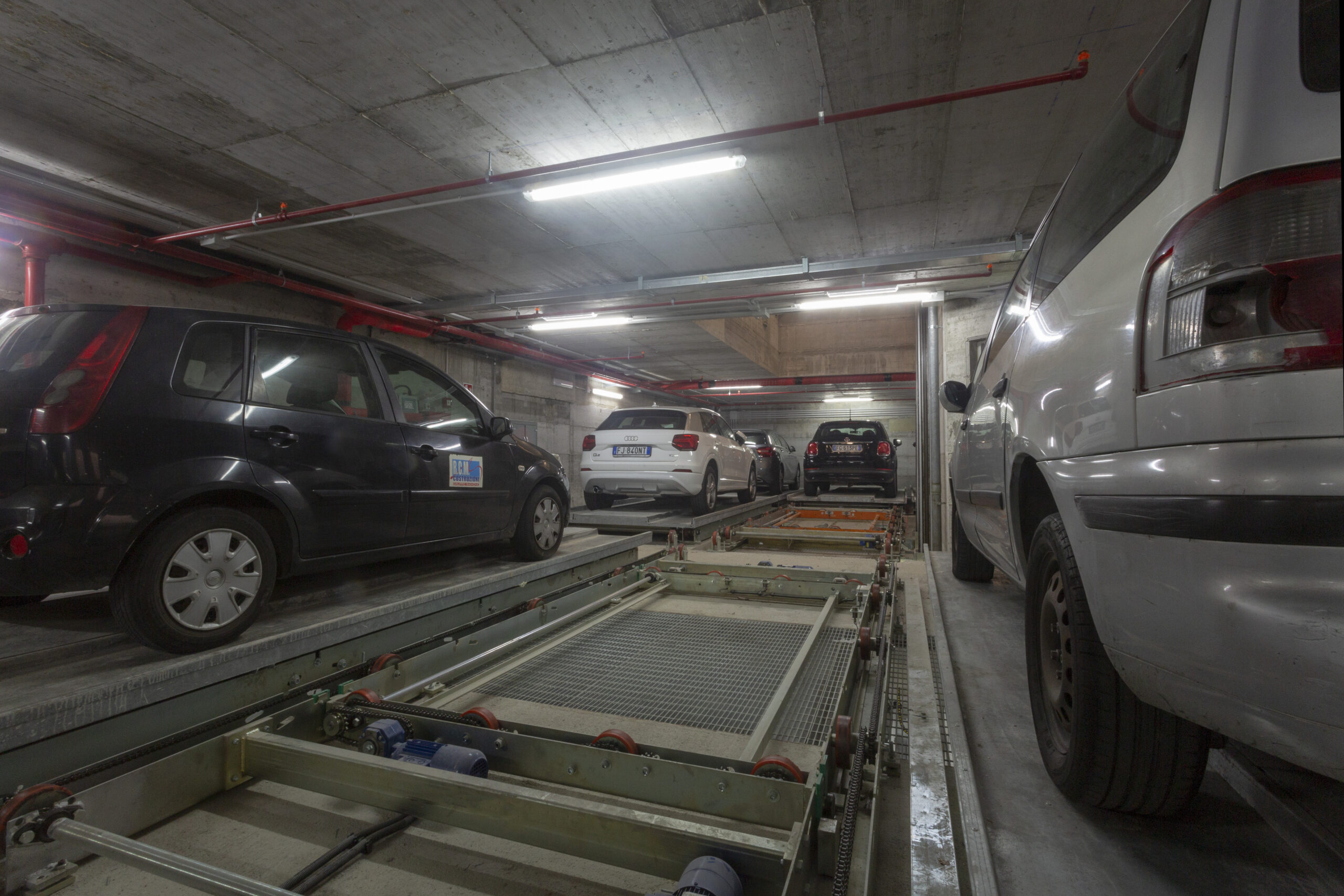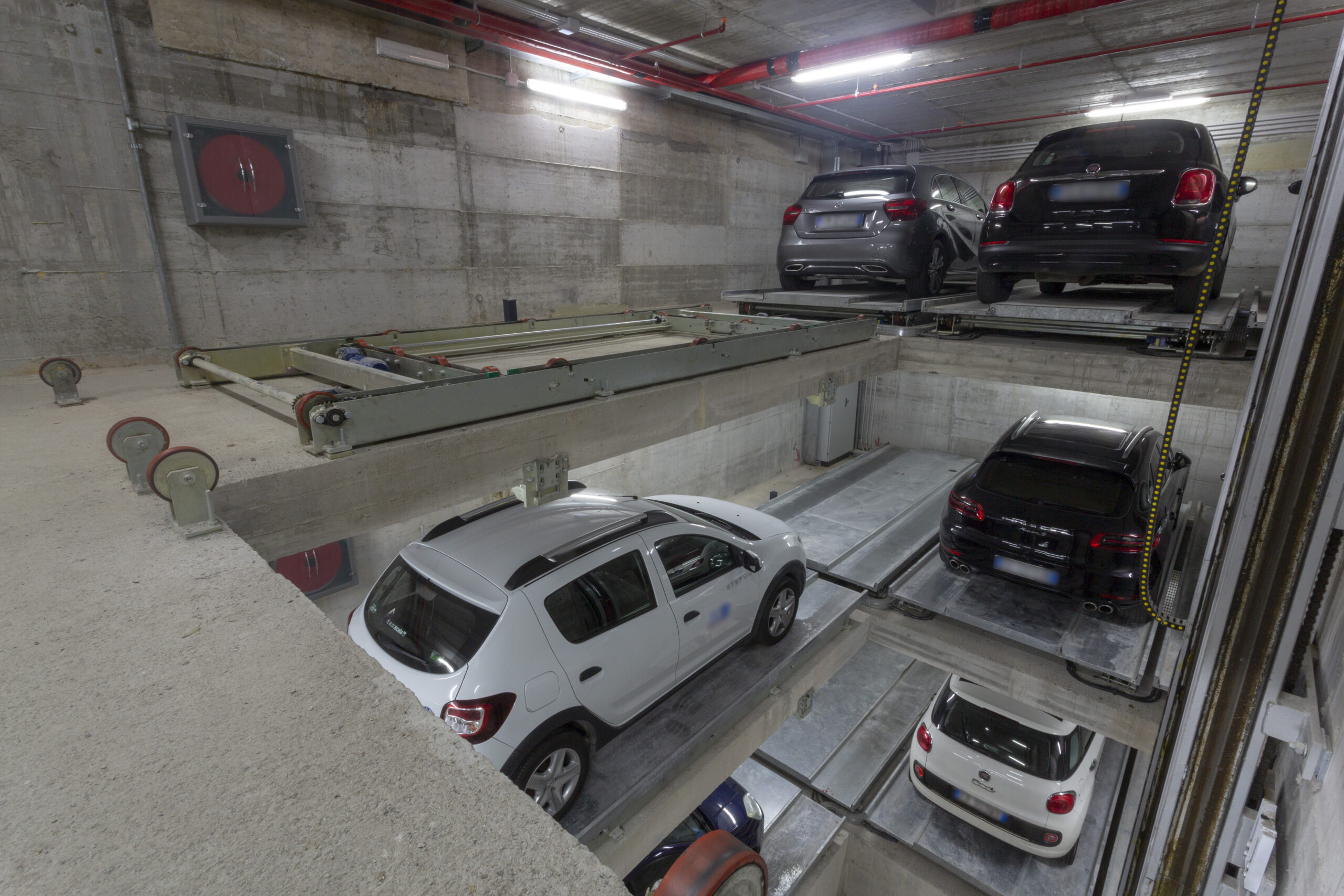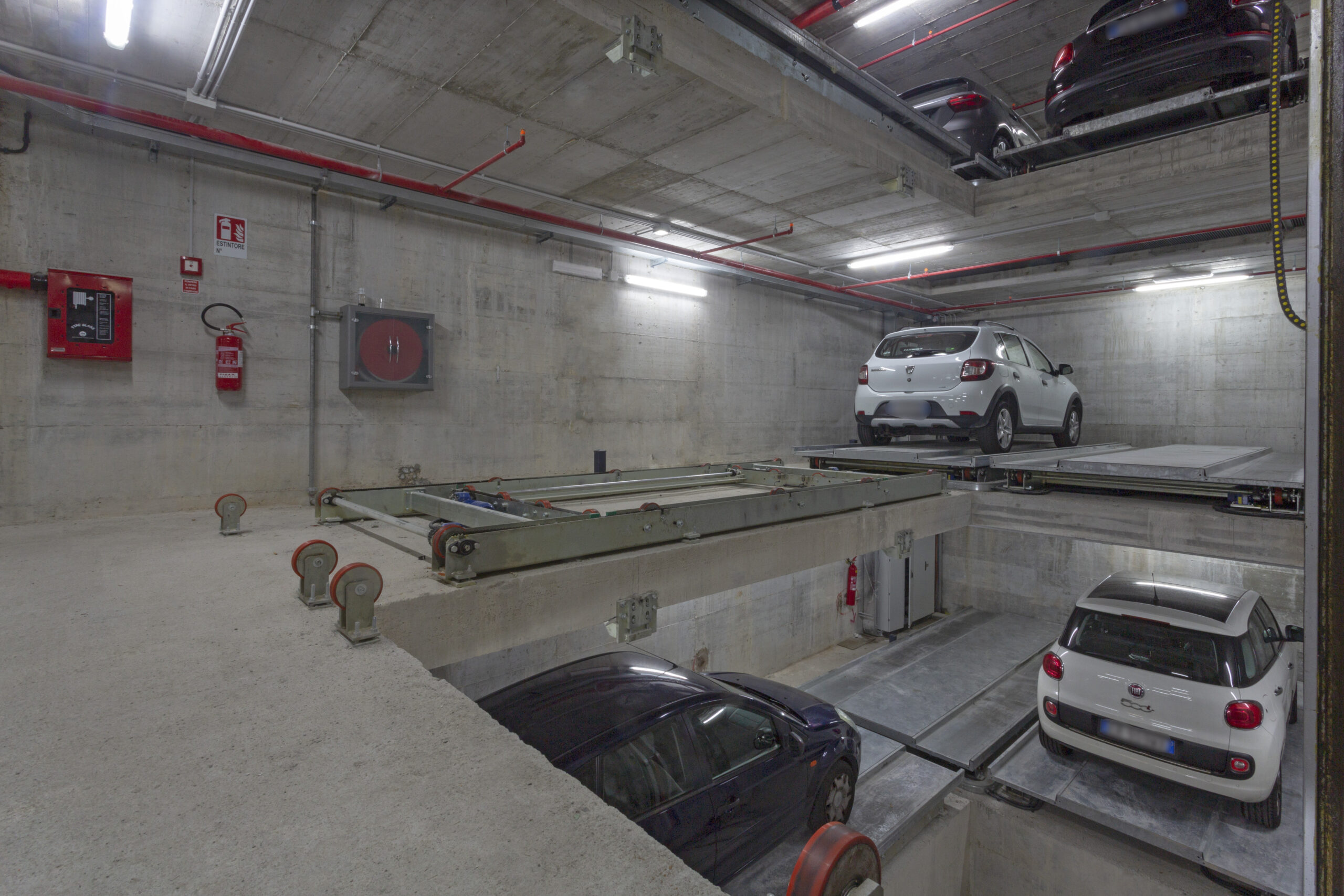 Abbiamo realizzato un sistema innovativo di parcheggio automatizzato a piattaforme triassiali dedicato alle autovetture dei nuovi residenti del quartiere di Salerno. Questo sistema opera su tre livelli interrati, facilitati da un ascensore centrale, offrendo complessivamente 38 posti auto indipendenti.