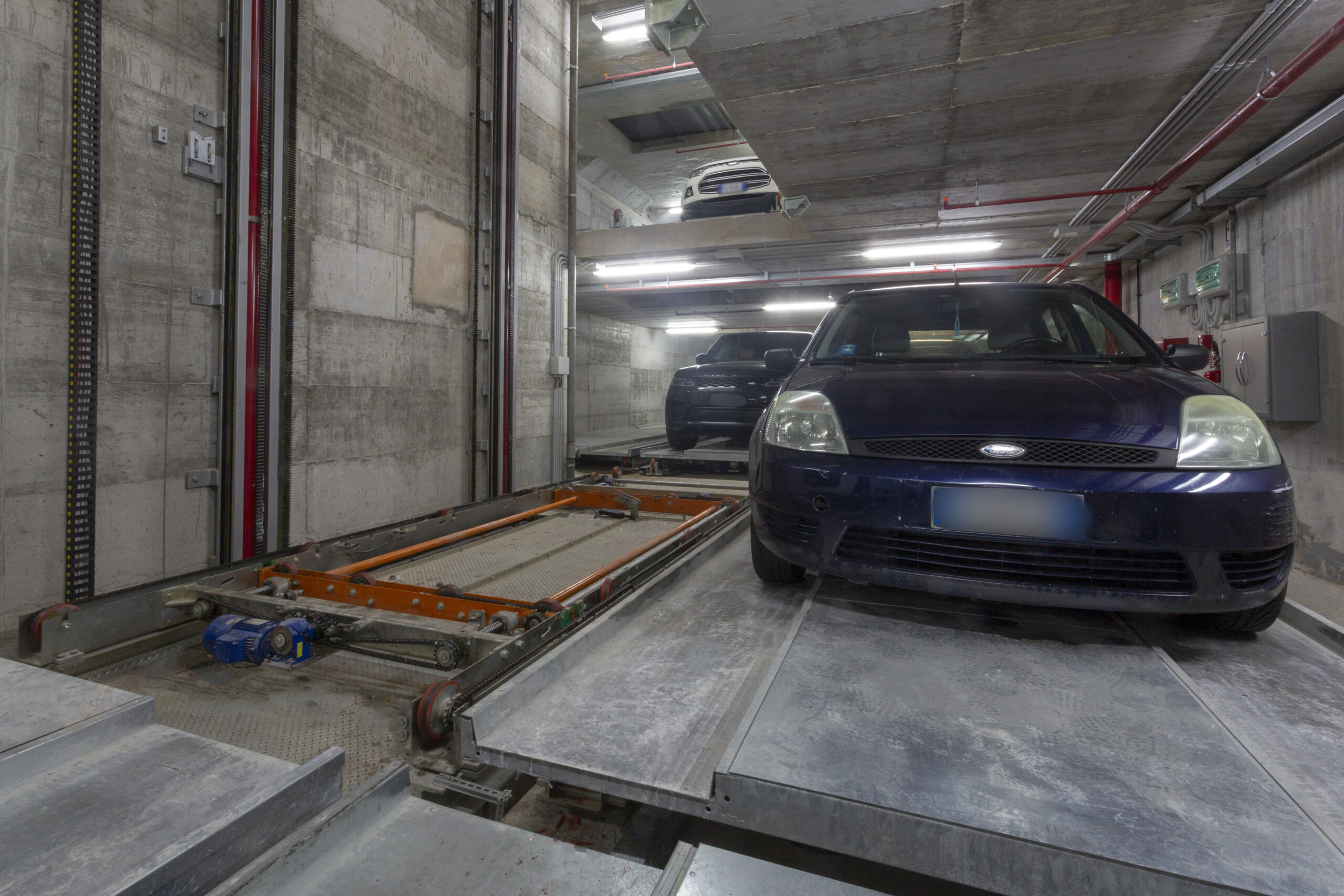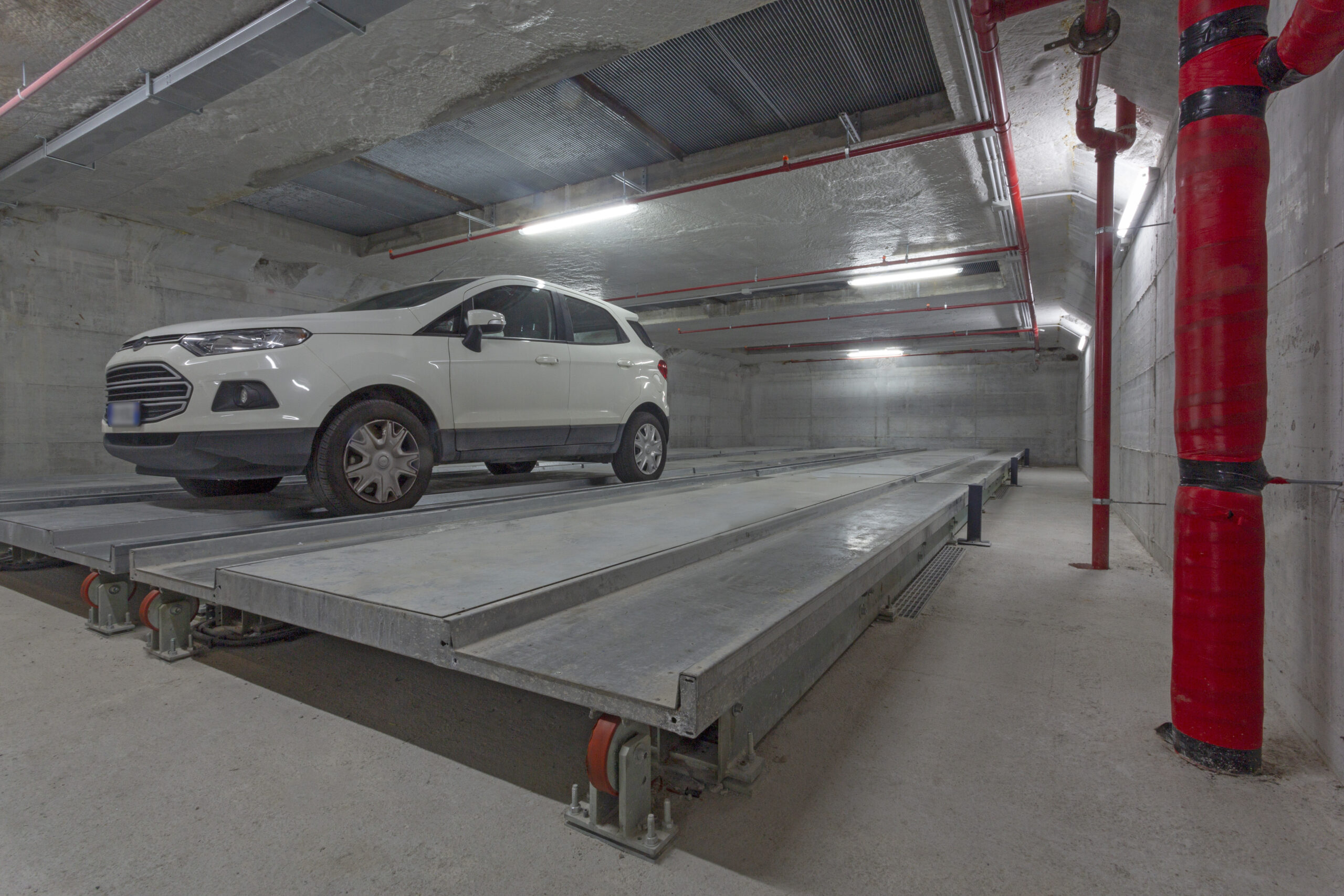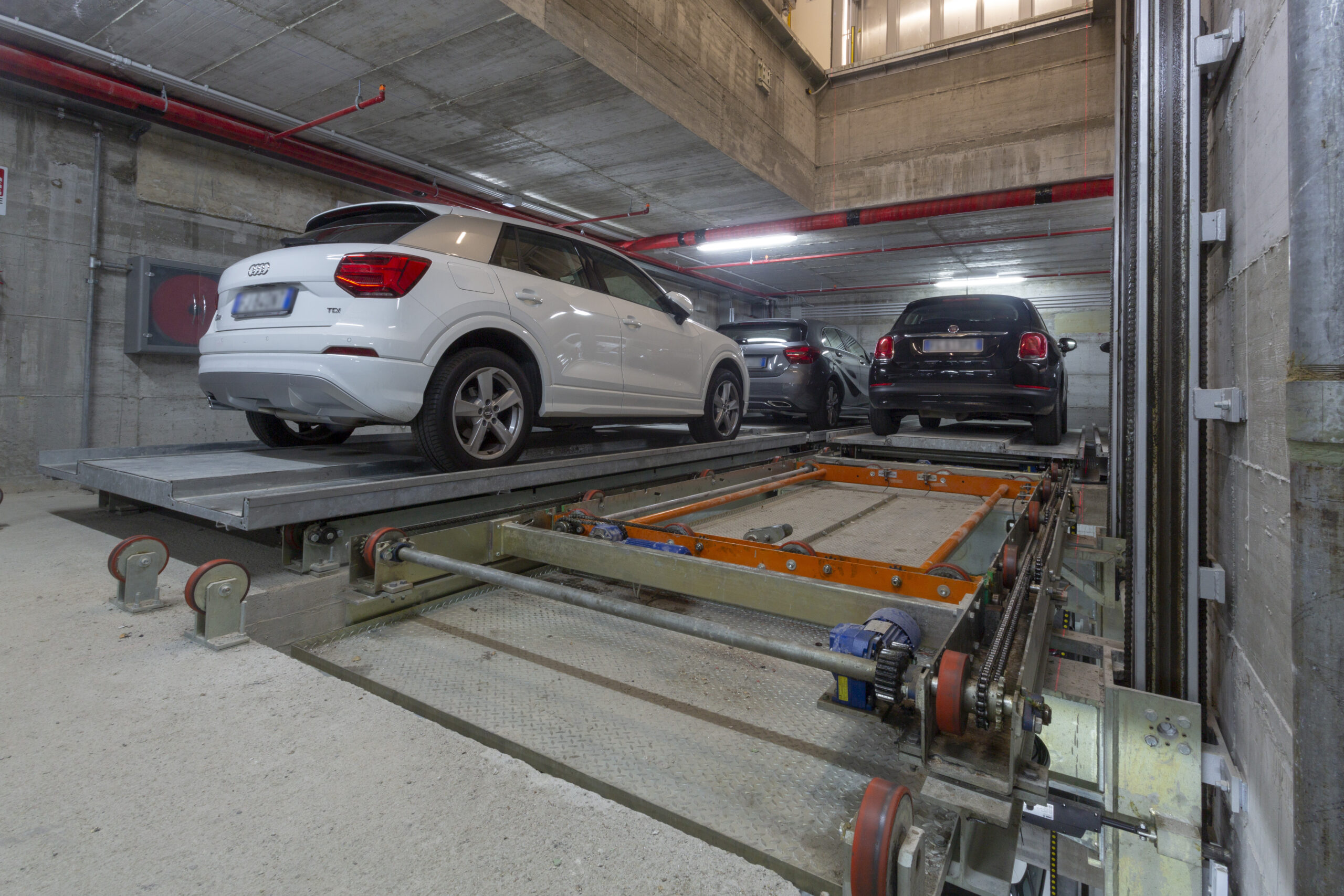 Abbiamo realizzato un sistema innovativo di parcheggio automatizzato a piattaforme triassiali dedicato alle autovetture dei nuovi residenti del quartiere di Salerno. Questo sistema opera su tre livelli interrati, facilitati da un ascensore centrale, offrendo complessivamente 38 posti auto indipendenti.